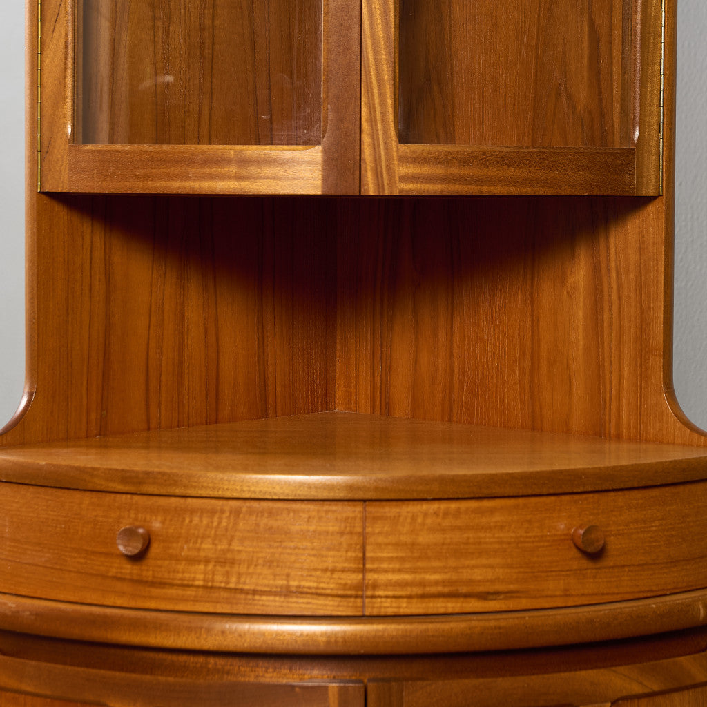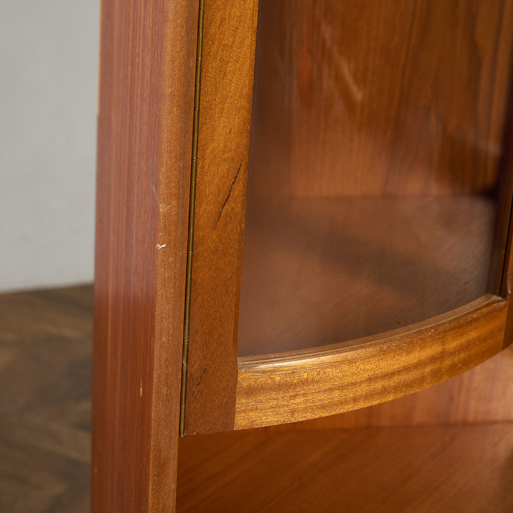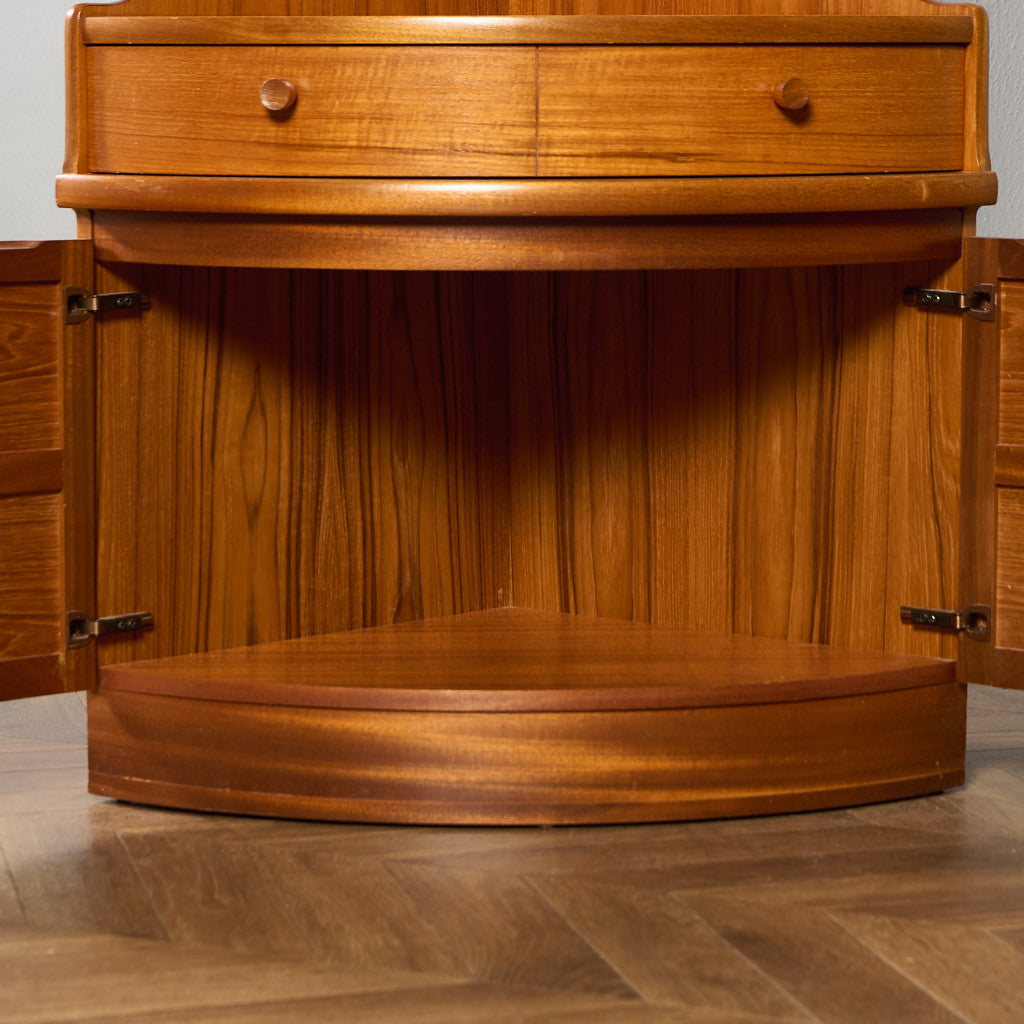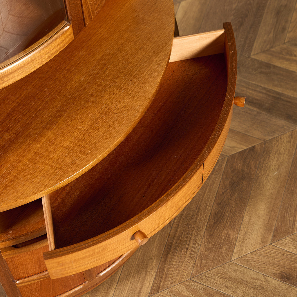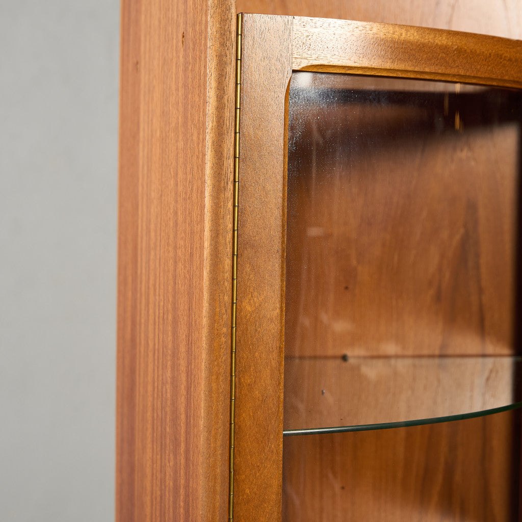 レア度の高いトールタイプのガラスコーナーキャビネットです。少しクラシック家具寄りの、湾曲した前面扉の框構造が印象的。ヴィンテージチークのあたたかな質感が味わい、手の込んだ仕上がりの洗練されたキャビネットです。G-PLANやMcINTOSHと比べて流通が少ないこともコレクター心をくすぐります。
