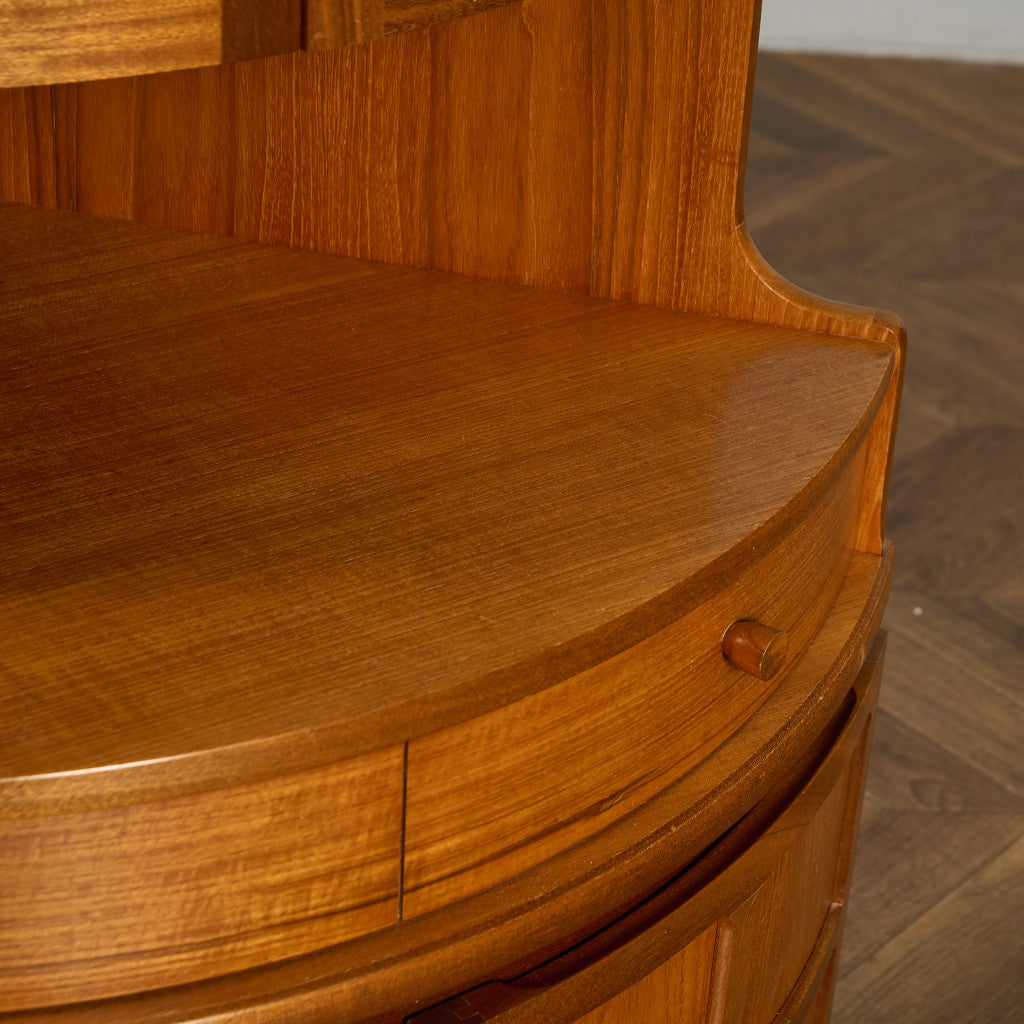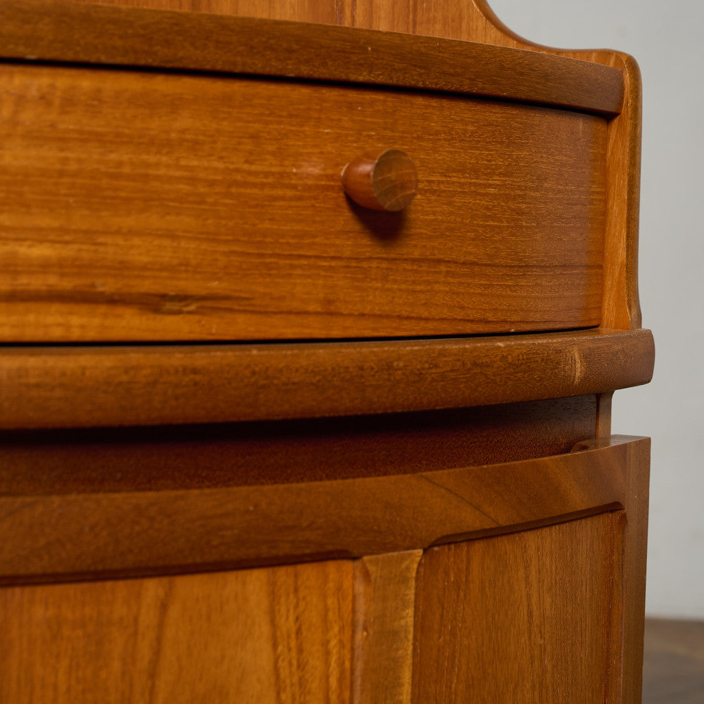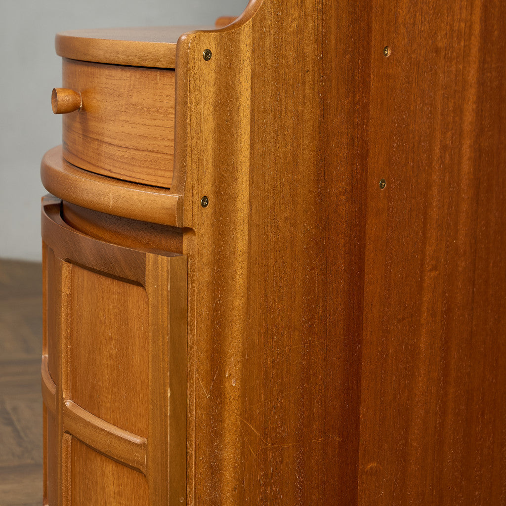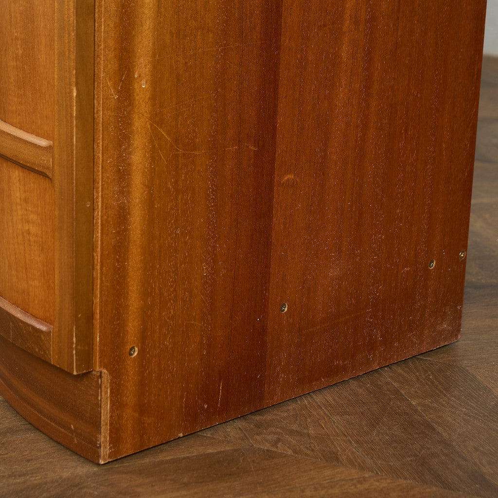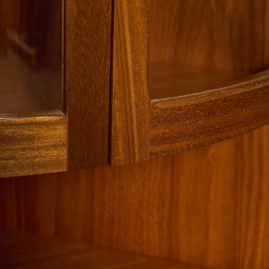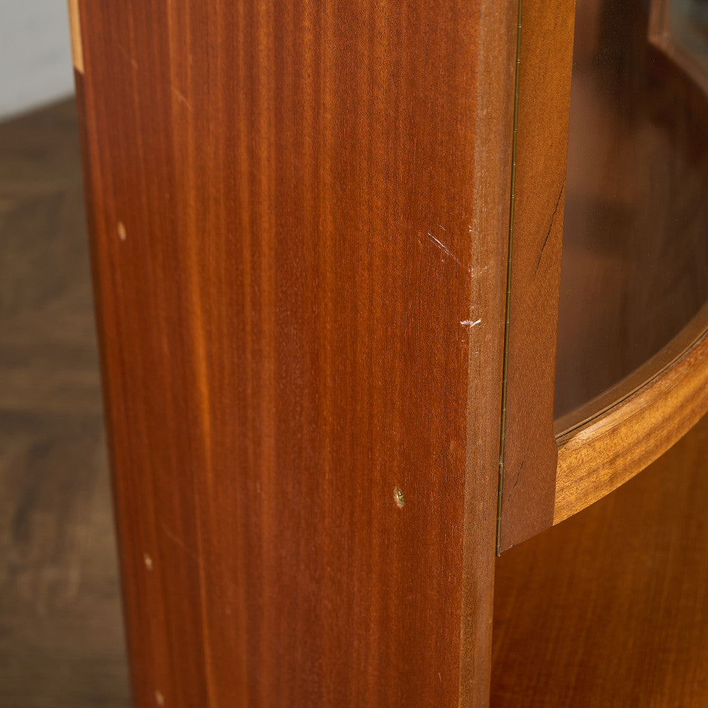 レア度の高いトールタイプのガラスコーナーキャビネットです。少しクラシック家具寄りの、湾曲した前面扉の框構造が印象的。ヴィンテージチークのあたたかな質感が味わい、手の込んだ仕上がりの洗練されたキャビネットです。G-PLANやMcINTOSHと比べて流通が少ないこともコレクター心をくすぐります。