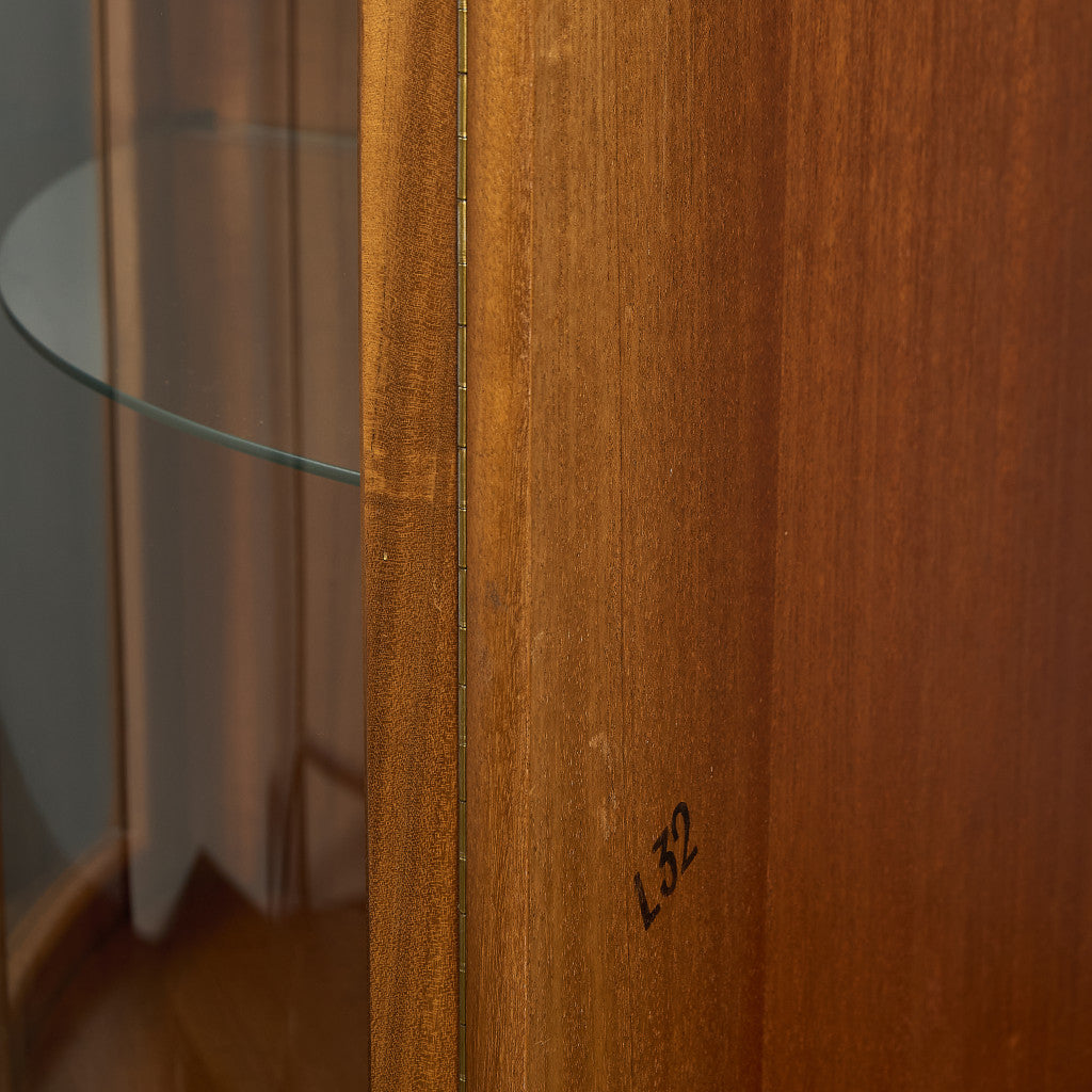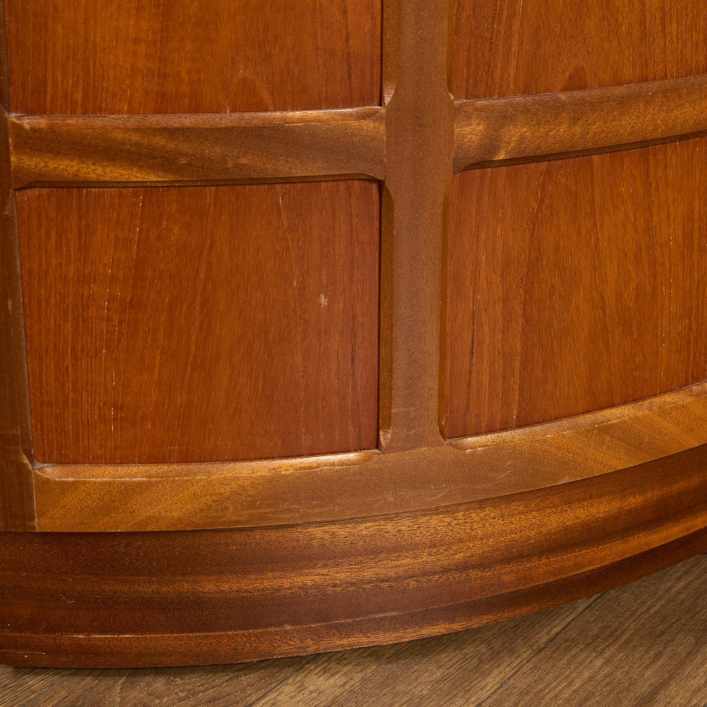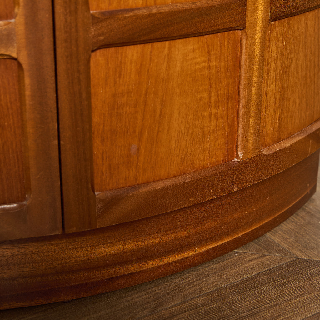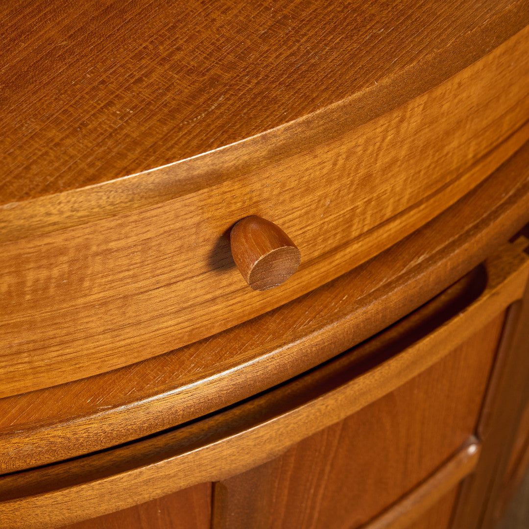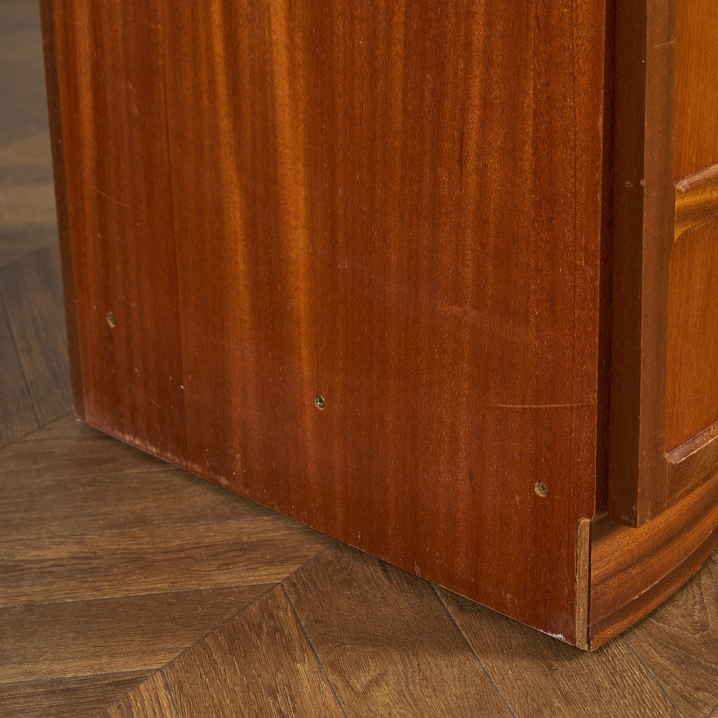 レア度の高いトールタイプのガラスコーナーキャビネットです。少しクラシック家具寄りの、湾曲した前面扉の框構造が印象的。ヴィンテージチークのあたたかな質感が味わい、手の込んだ仕上がりの洗練されたキャビネットです。G-PLANやMcINTOSHと比べて流通が少ないこともコレクター心をくすぐります。