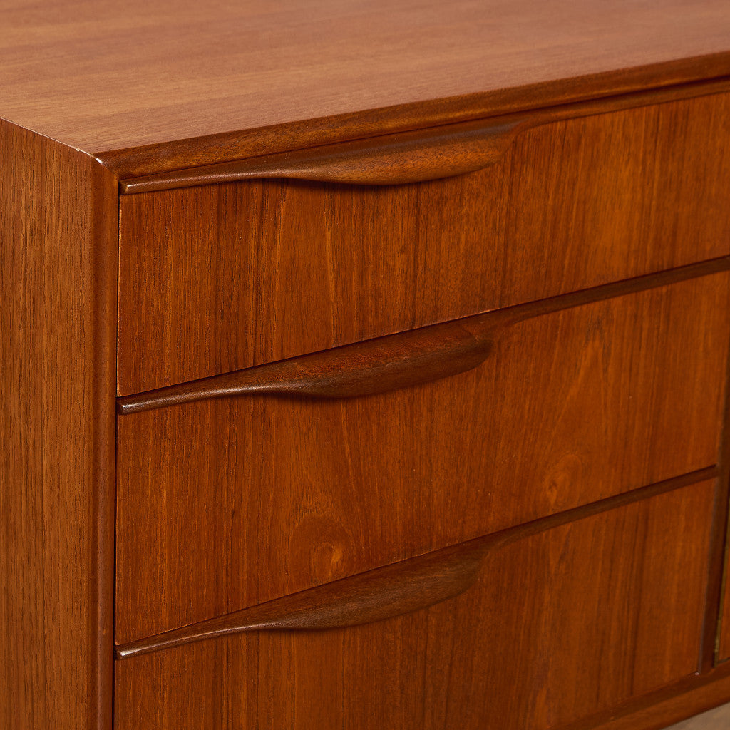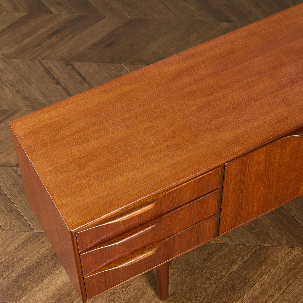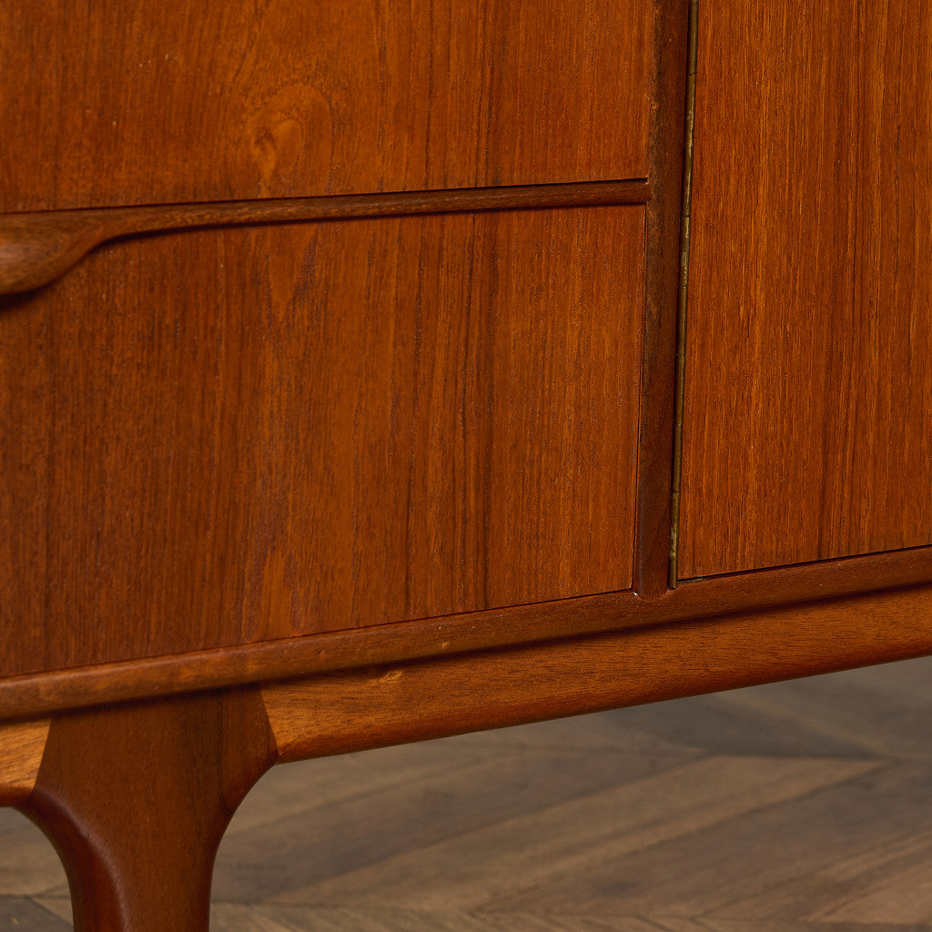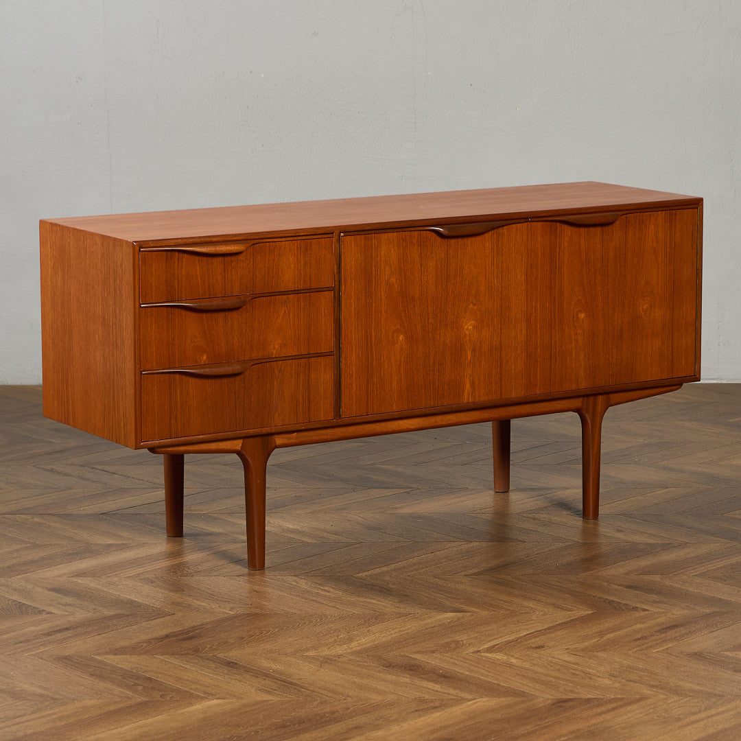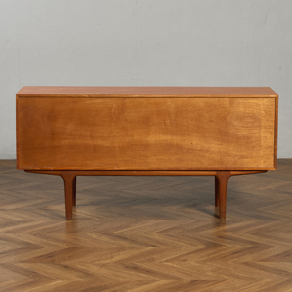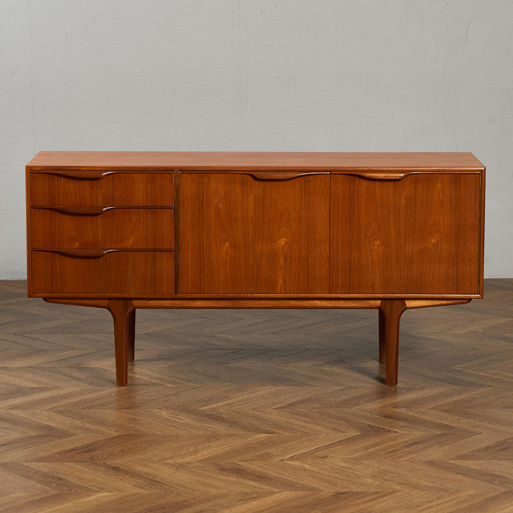取手やなめらかな脚フレームの意匠など、ハイクオリティーなディテールを備えたサイドボード。シンプルなフォルムながら上質な存在感をたたえる一品で、流通量の少ないレアなショートモデルです。英国ミッドセンチュリーの黄金期を代表するA.H.McINTOSH社の傑作であり、チーク材の温かみある木目と彫刻的な曲線美が織りなす、北欧家具にも比肩する洗練されたデザインが魅力です。コンパクトながら収納力も十分で、現代の住空間にこそ真価を発揮します。ヴィンテージとしての希少価値と普遍的な美しさを兼ね備えています。