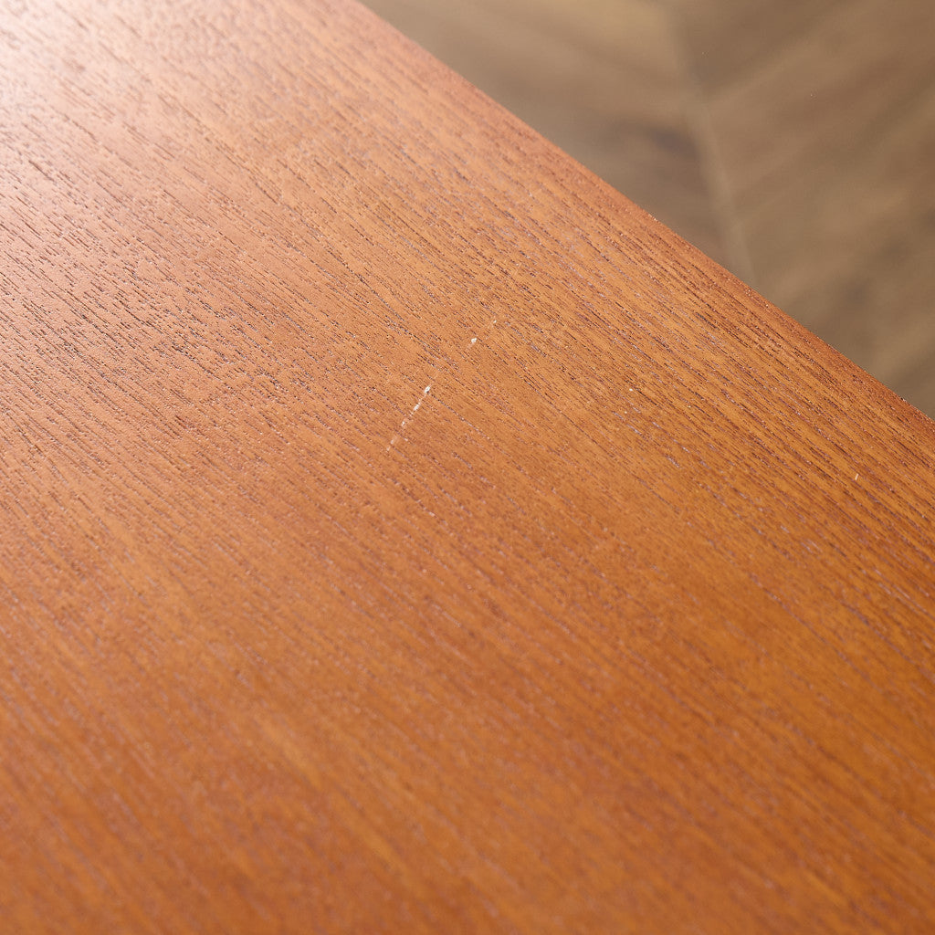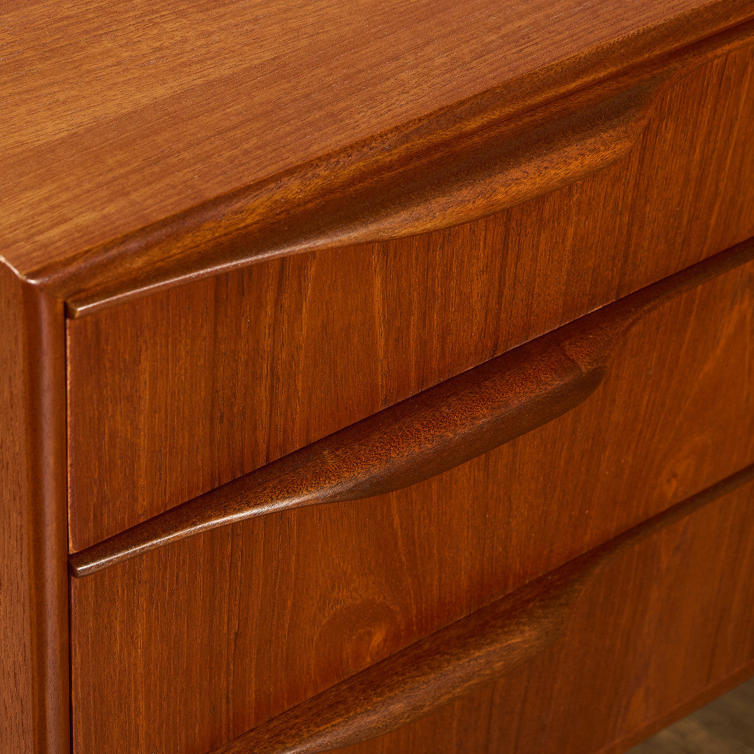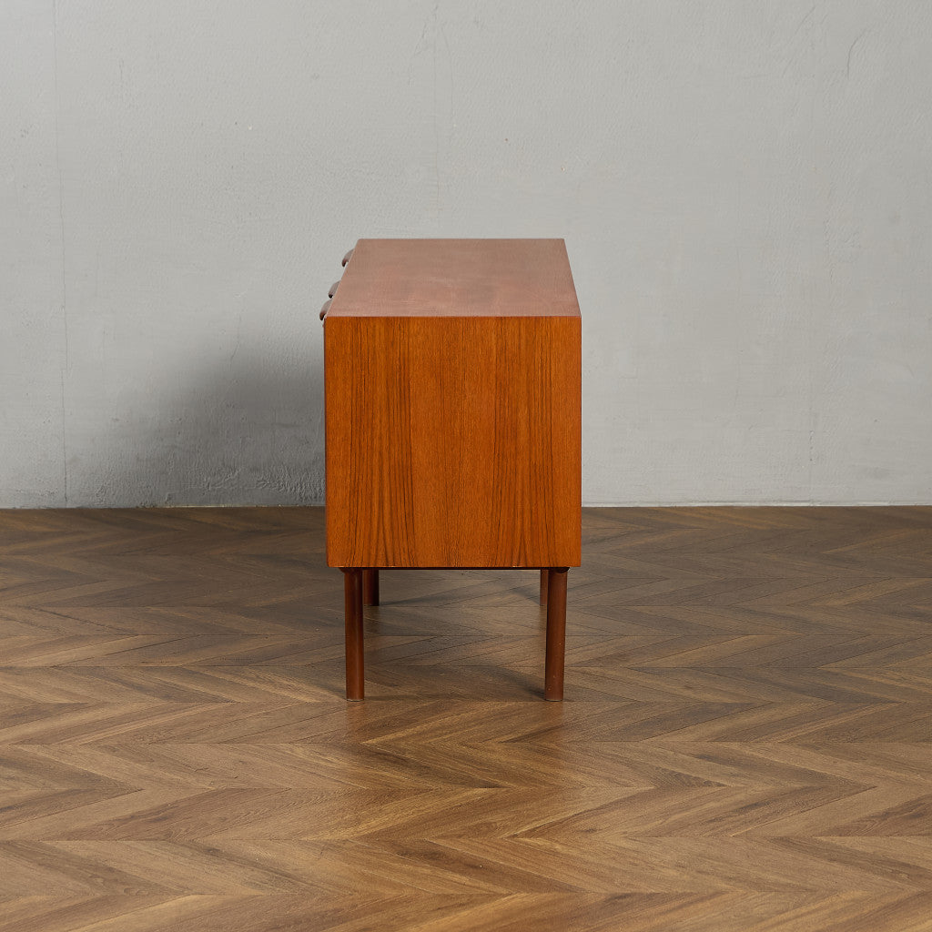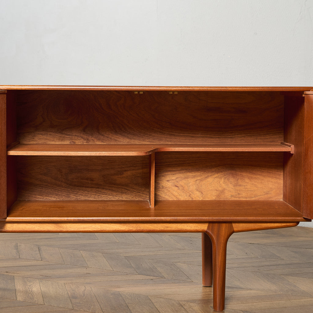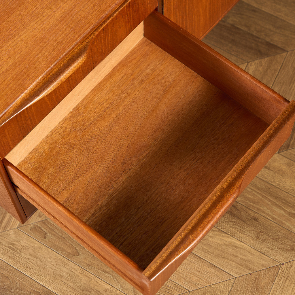 取手やなめらかな脚フレームの意匠など、ハイクオリティーなディテールを備えたサイドボード。シンプルなフォルムながら上質な存在感をたたえる一品で、流通量の少ないレアなショートモデルです。英国ミッドセンチュリーの黄金期を代表するA.H.McINTOSH社の傑作であり、チーク材の温かみある木目と彫刻的な曲線美が織りなす、北欧家具にも比肩する洗練されたデザインが魅力です。コンパクトながら収納力も十分で、現代の住空間にこそ真価を発揮します。ヴィンテージとしての希少価値と普遍的な美しさを兼ね備えています。