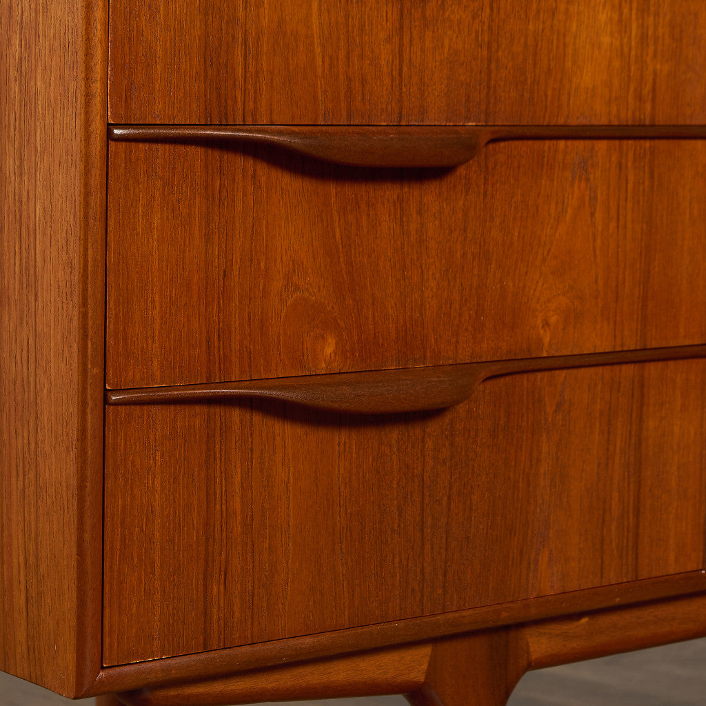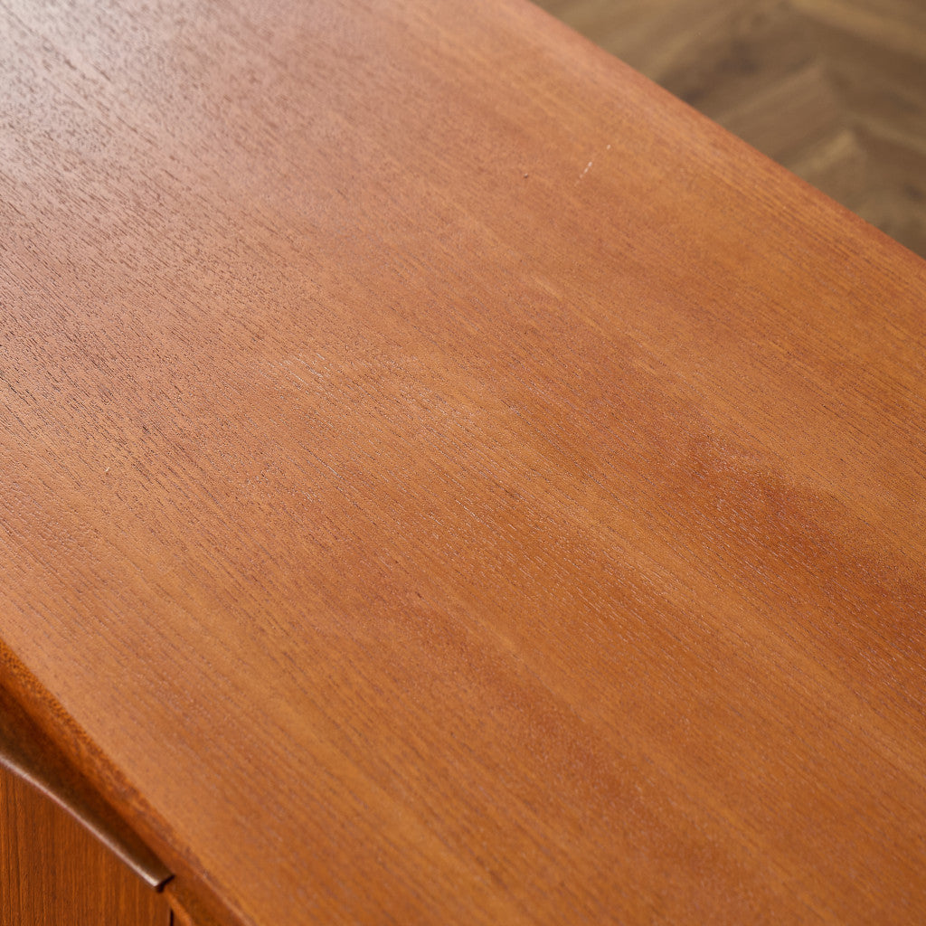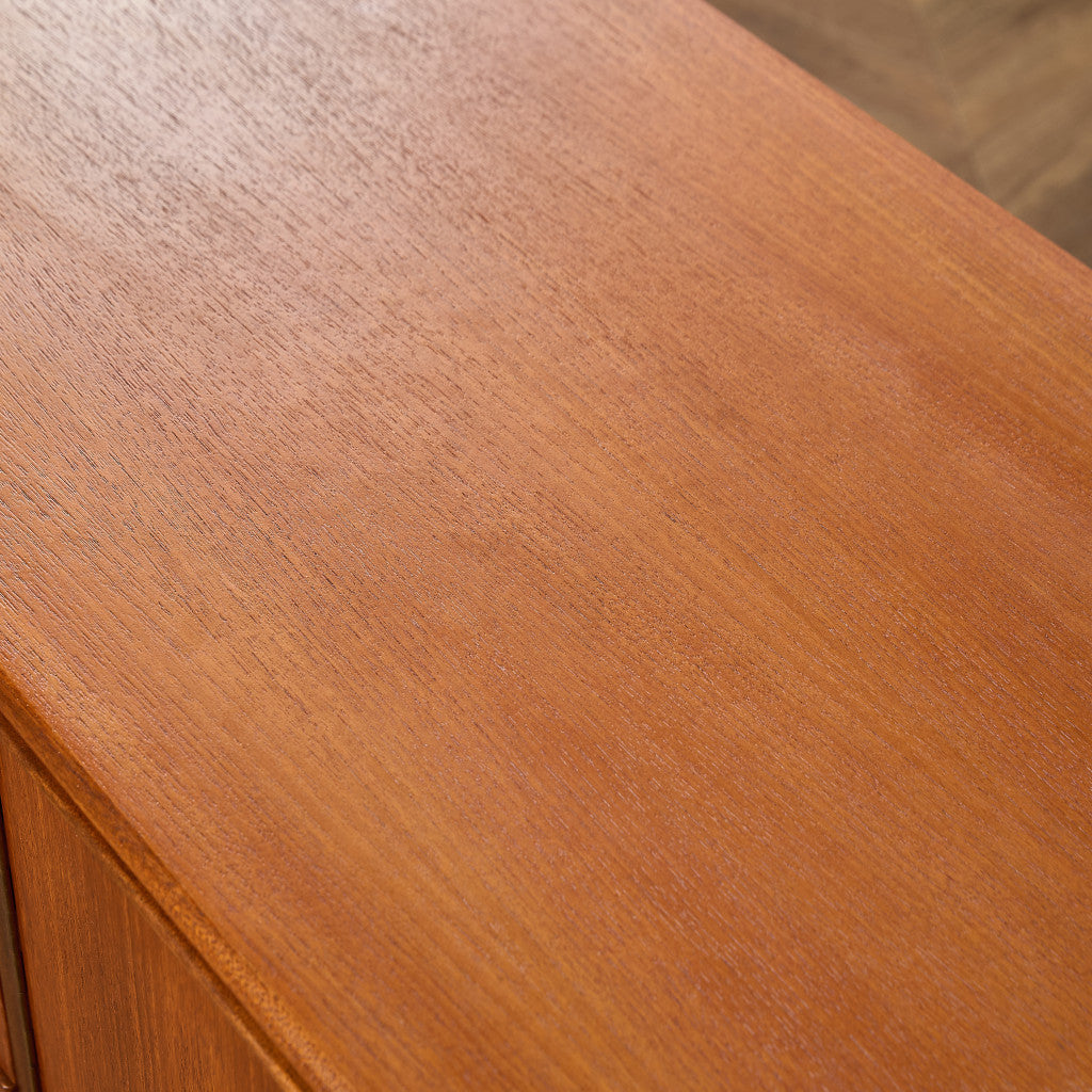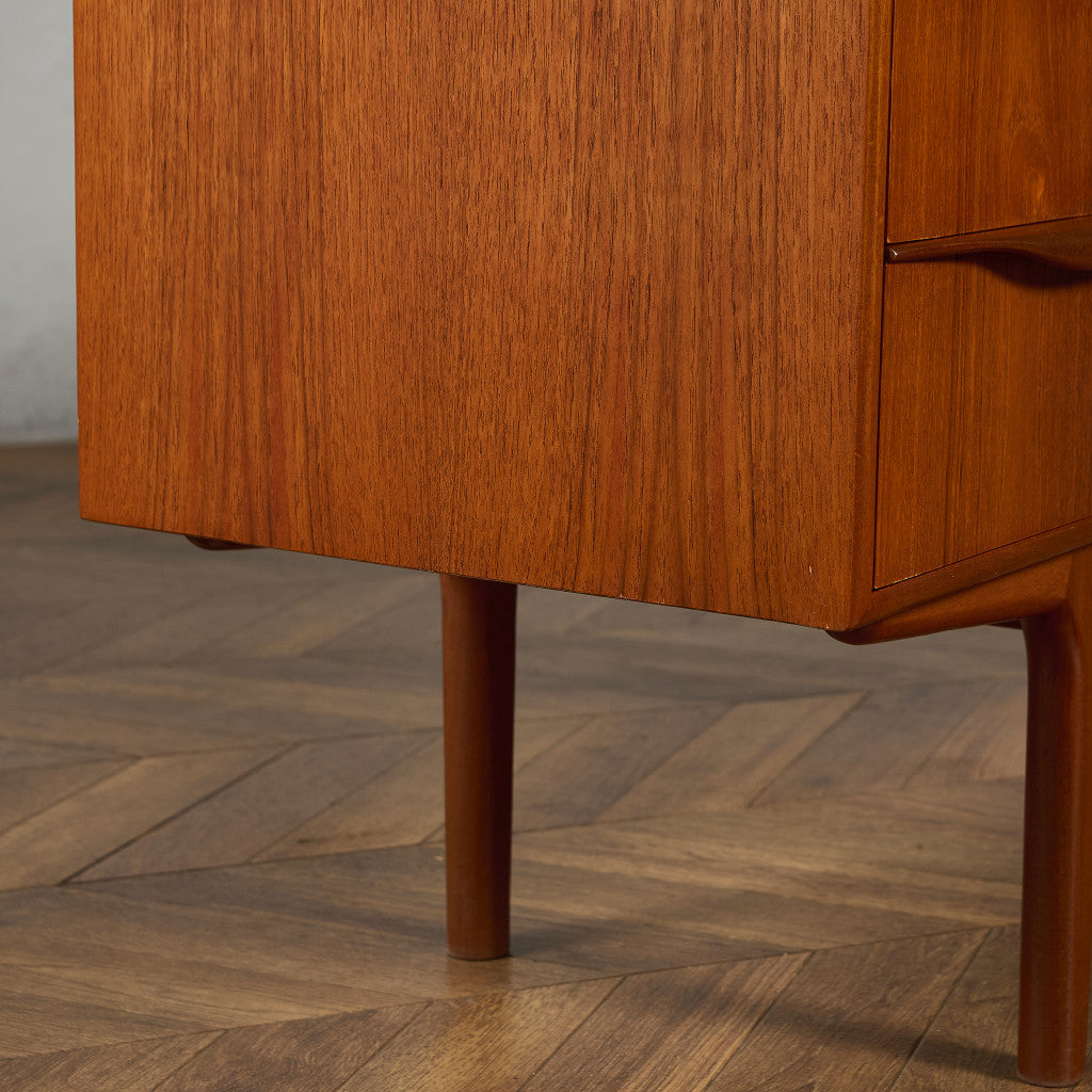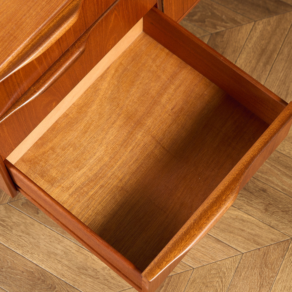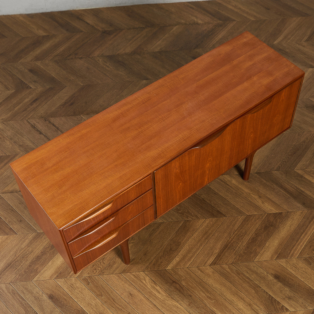 取手やなめらかな脚フレームの意匠など、ハイクオリティーなディテールを備えたサイドボード。シンプルなフォルムながら上質な存在感をたたえる一品で、流通量の少ないレアなショートモデルです。英国ミッドセンチュリーの黄金期を代表するA.H.McINTOSH社の傑作であり、チーク材の温かみある木目と彫刻的な曲線美が織りなす、北欧家具にも比肩する洗練されたデザインが魅力です。コンパクトながら収納力も十分で、現代の住空間にこそ真価を発揮します。ヴィンテージとしての希少価値と普遍的な美しさを兼ね備えています。