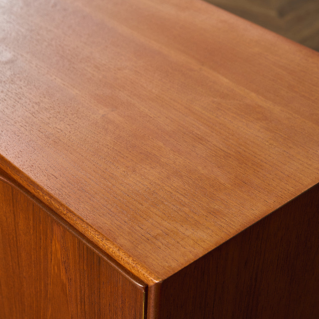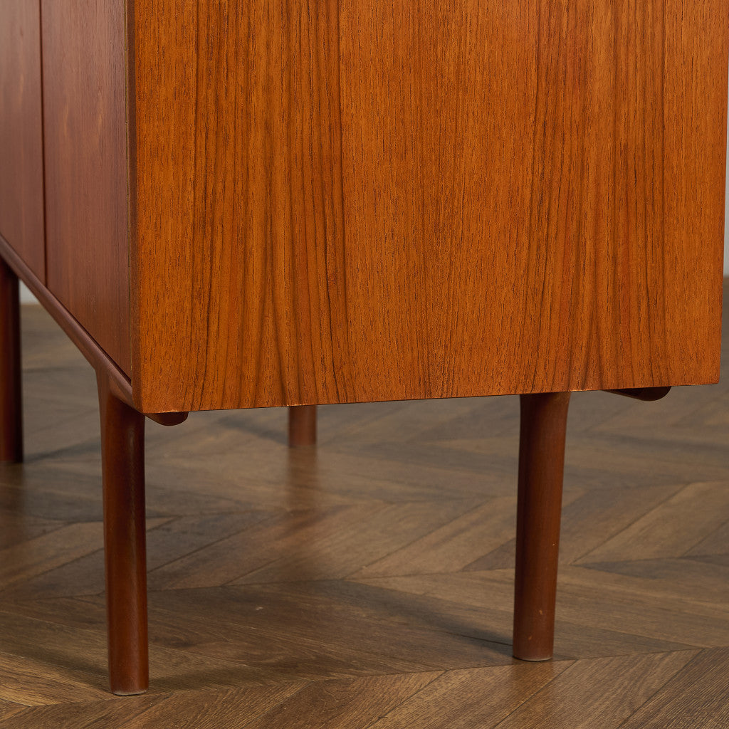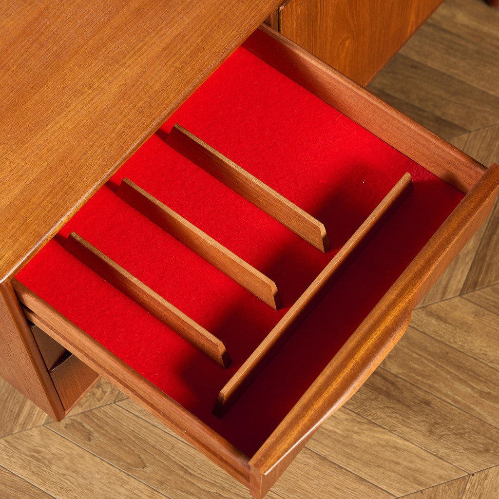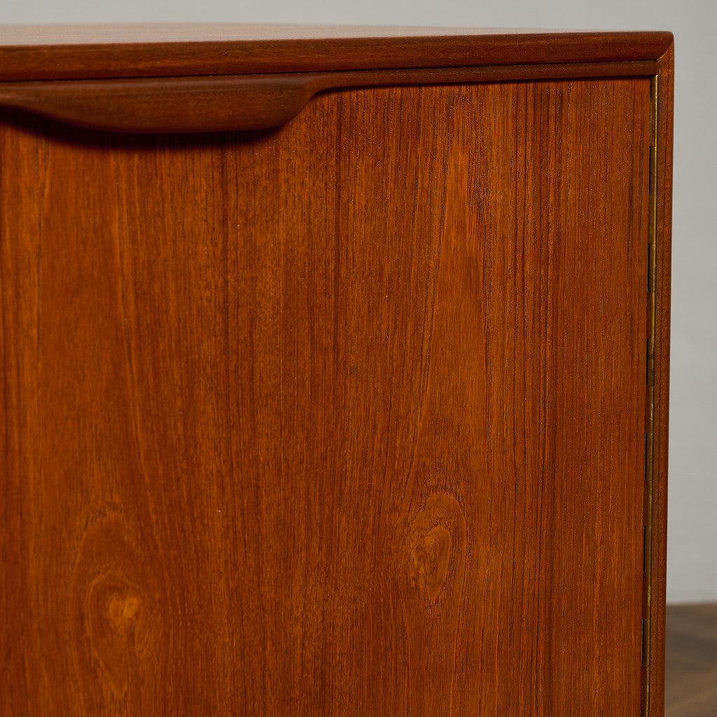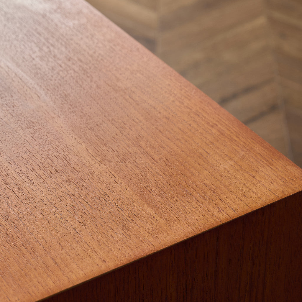 取手やなめらかな脚フレームの意匠など、ハイクオリティーなディテールを備えたサイドボード。シンプルなフォルムながら上質な存在感をたたえる一品で、流通量の少ないレアなショートモデルです。英国ミッドセンチュリーの黄金期を代表するA.H.McINTOSH社の傑作であり、チーク材の温かみある木目と彫刻的な曲線美が織りなす、北欧家具にも比肩する洗練されたデザインが魅力です。コンパクトながら収納力も十分で、現代の住空間にこそ真価を発揮します。ヴィンテージとしての希少価値と普遍的な美しさを兼ね備えています。