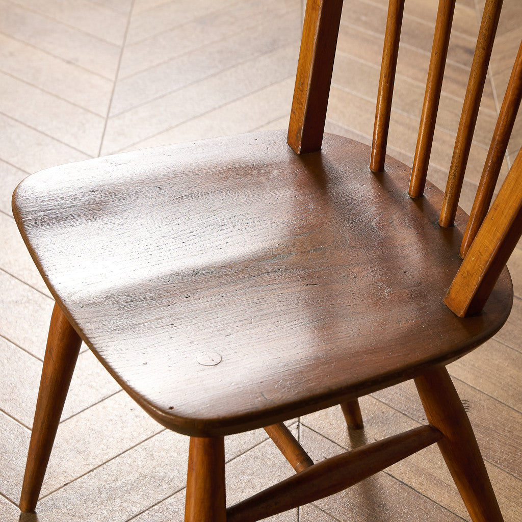 ERCOLのアイコン的存在であるウィンザーチェアシリーズの中で、最もオーソドックスなスタイルのフープバックチェアは「ボウバック(弓型の背もたれ)」という、クラシカルなデザインをベースに作られています。様々なバージョンがあり、背もたれのスポーク数が4本、5本、6本の3タイプ、座面はノーマル型とバイオリン型の2タイプ、大きさはノーマルサイズとラージサイズがあり、さらに6本スポークのチェアにはストレートレッグやアーム付きなどが存在し、その種類の豊富さもコレクター心をくすぐる大きな魅力となっています。特にスポーク5本タイプは流通量が少なく、希少性の高いアイテムです。