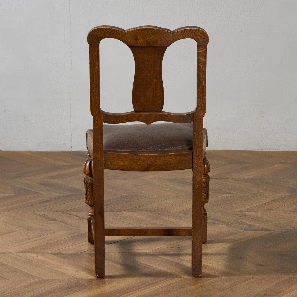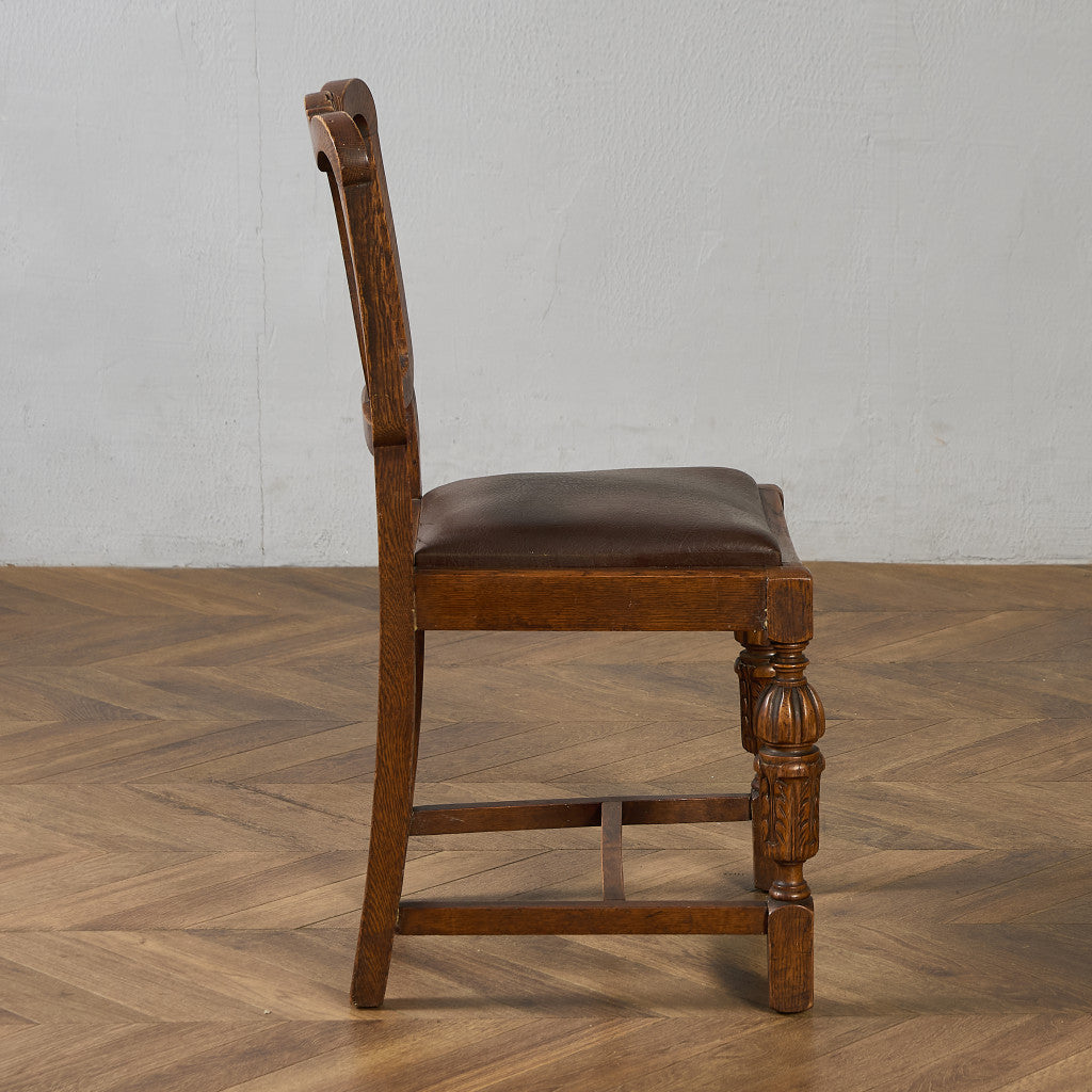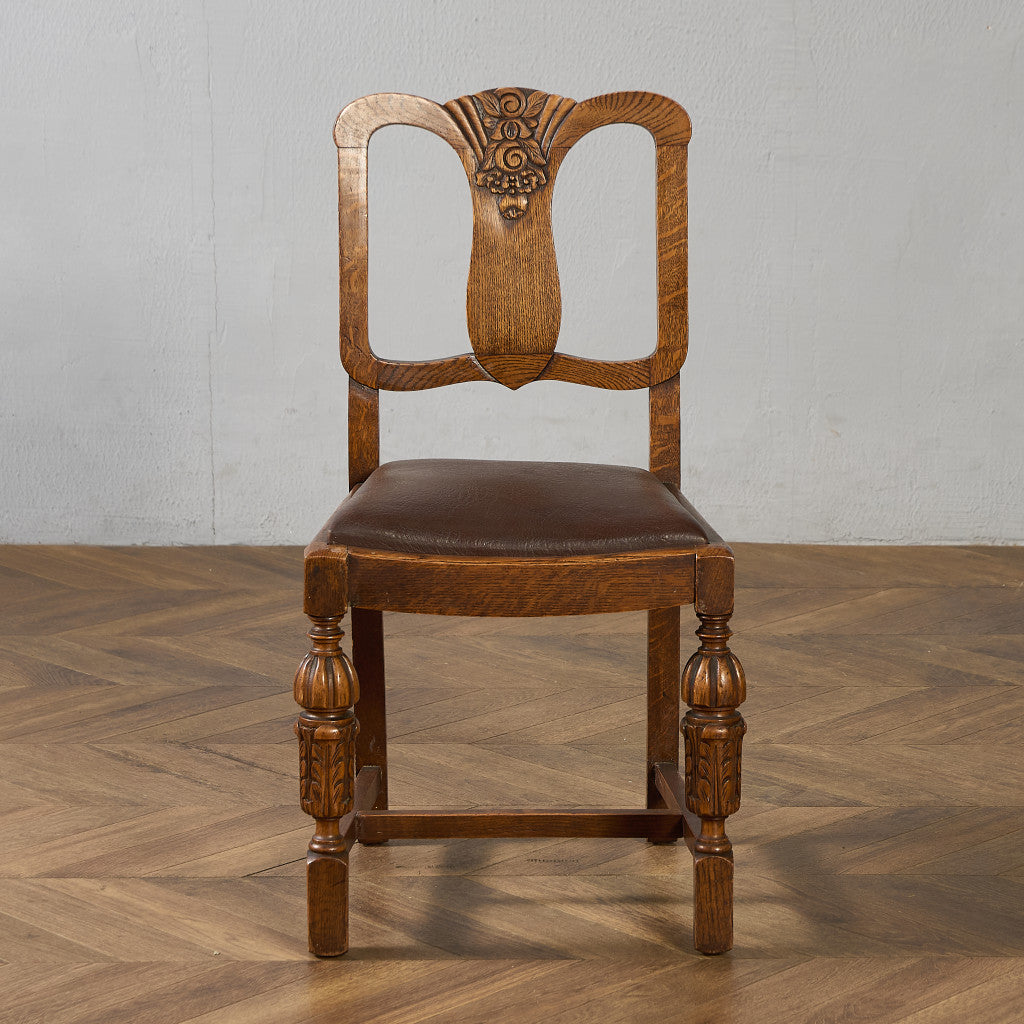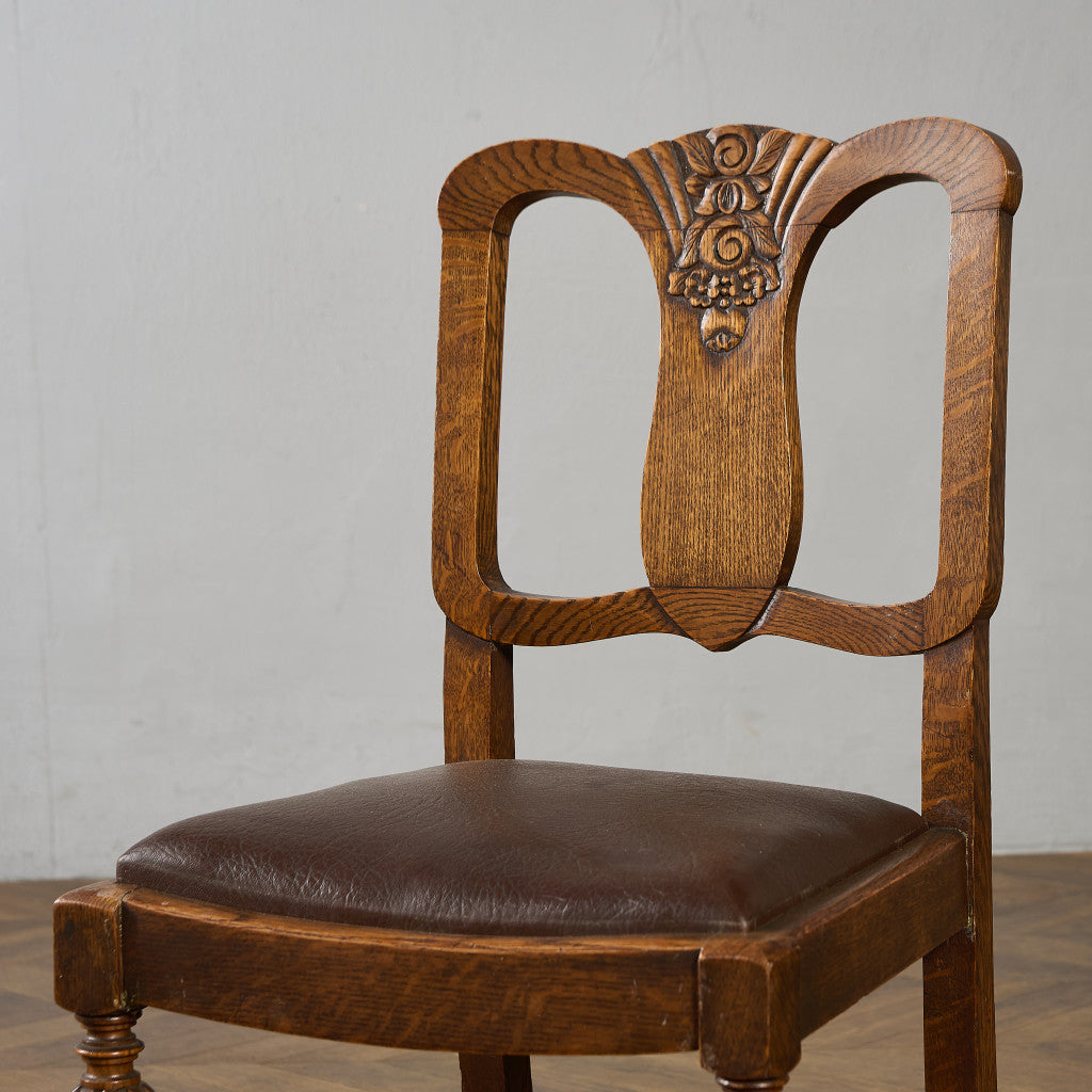 背もたれの木彫刻や脚部に施されたバルバスレッグが美しい上品なダイニングチェア。古き良き西欧の伝統を感じさせるクラシカルなデザインで、使い込まれて程よく古びた風合いが素朴で優しい雰囲気を演出します。