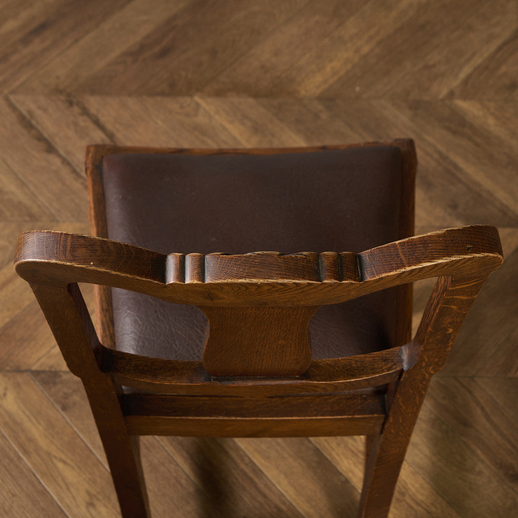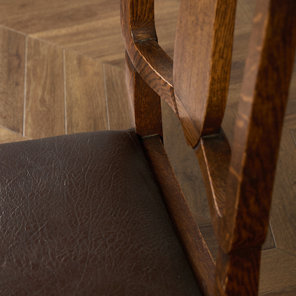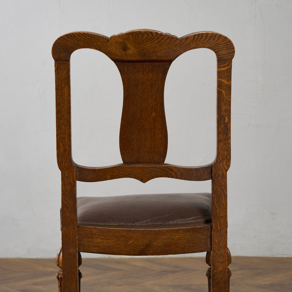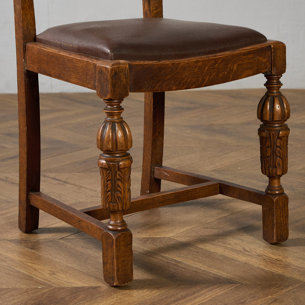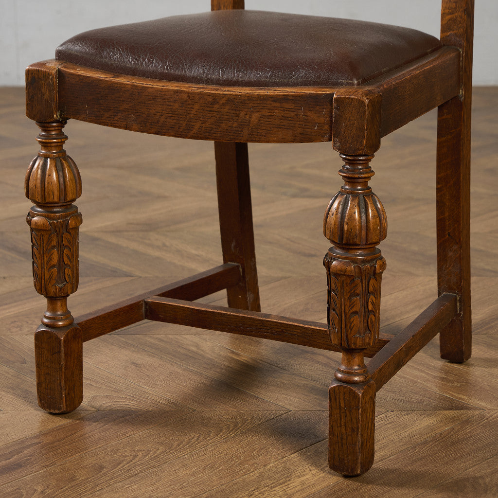 背もたれの木彫刻や脚部に施されたバルバスレッグが美しい上品なダイニングチェア。古き良き西欧の伝統を感じさせるクラシカルなデザインで、使い込まれて程よく古びた風合いが素朴で優しい雰囲気を演出します。