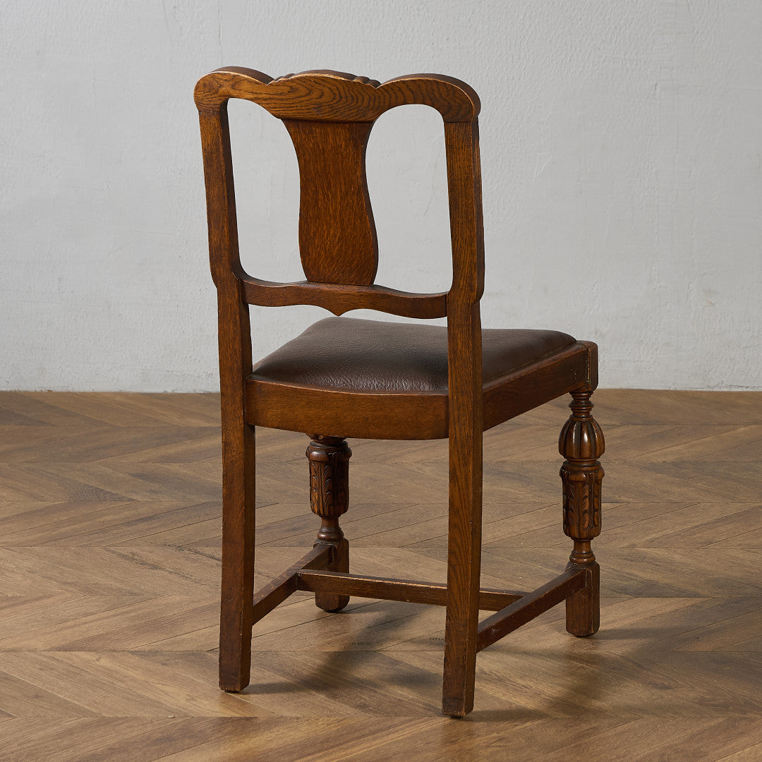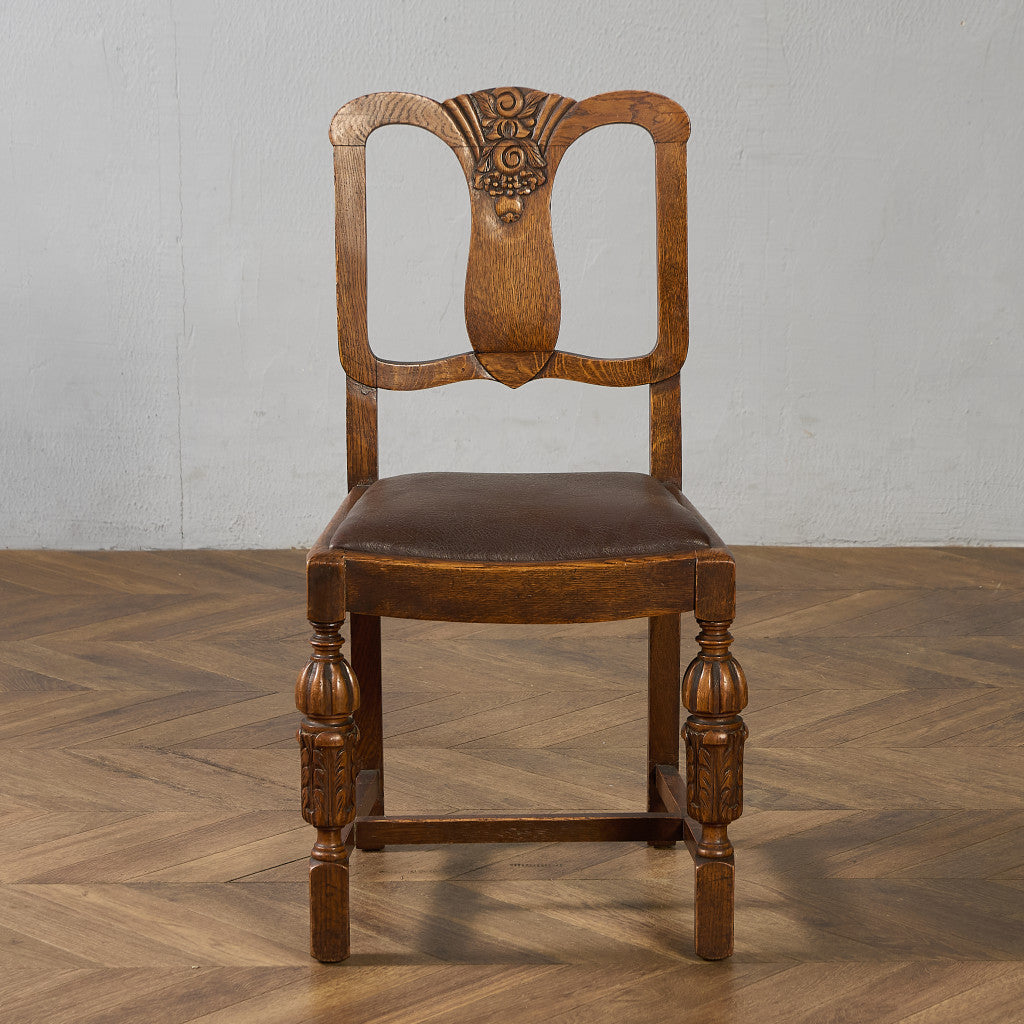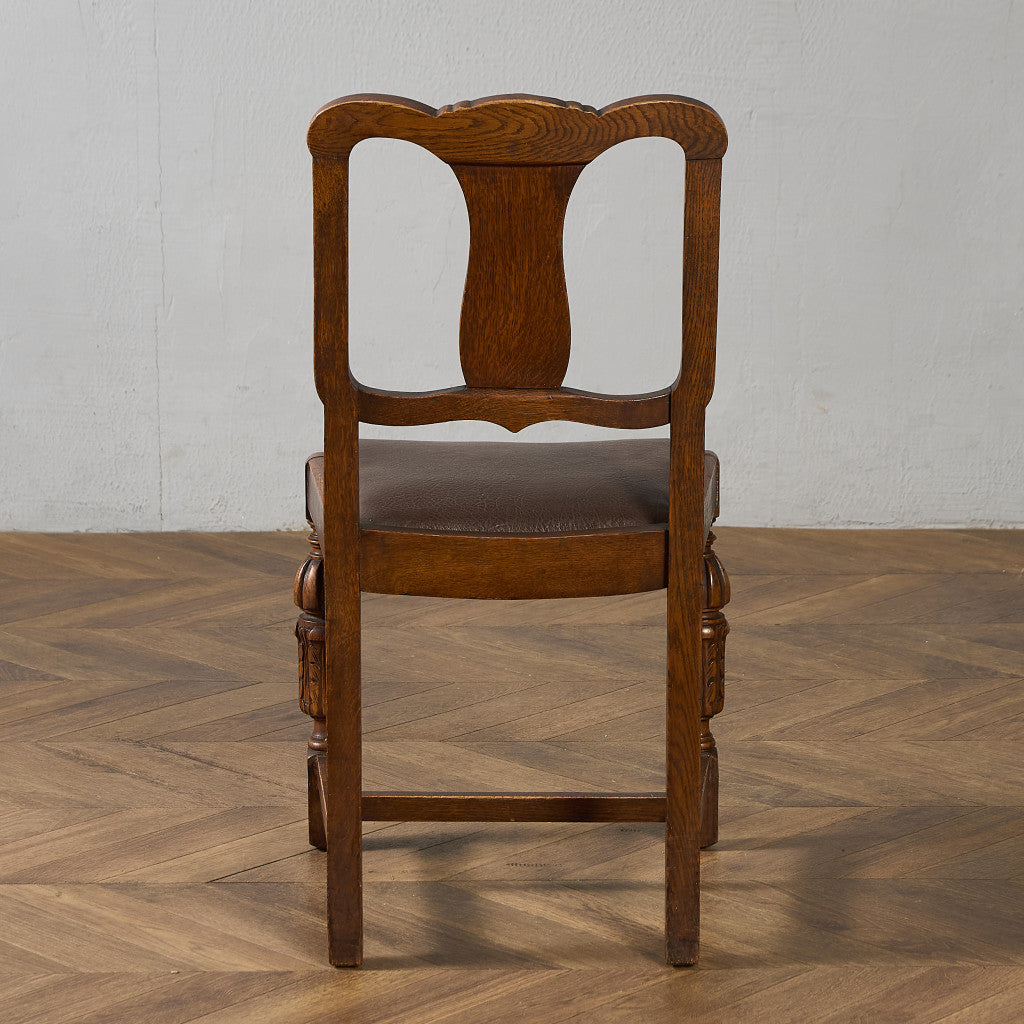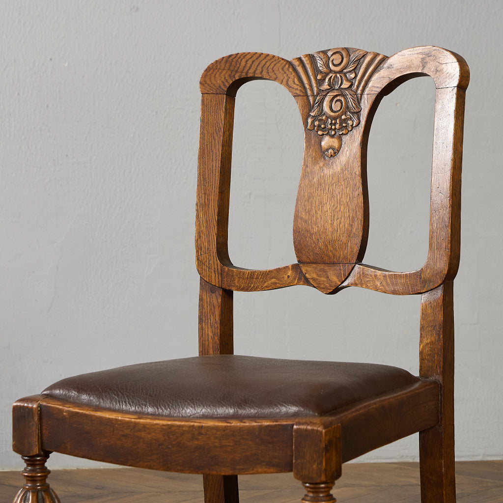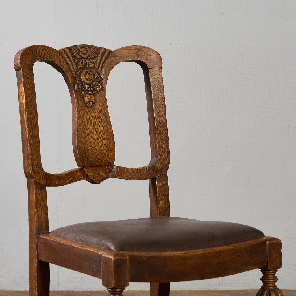 背もたれの木彫刻や脚部に施されたバルバスレッグが美しい上品なダイニングチェア。古き良き西欧の伝統を感じさせるクラシカルなデザインで、使い込まれて程よく古びた風合いが素朴で優しい雰囲気を演出します。