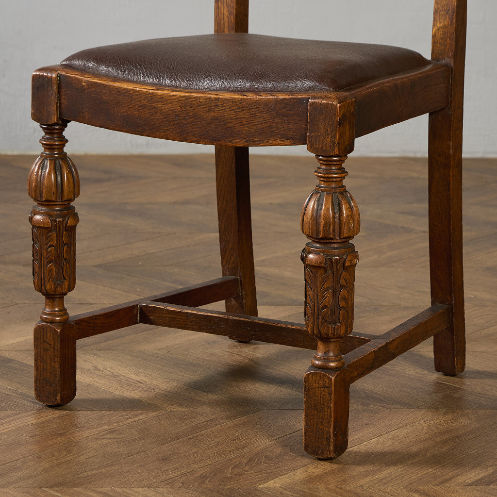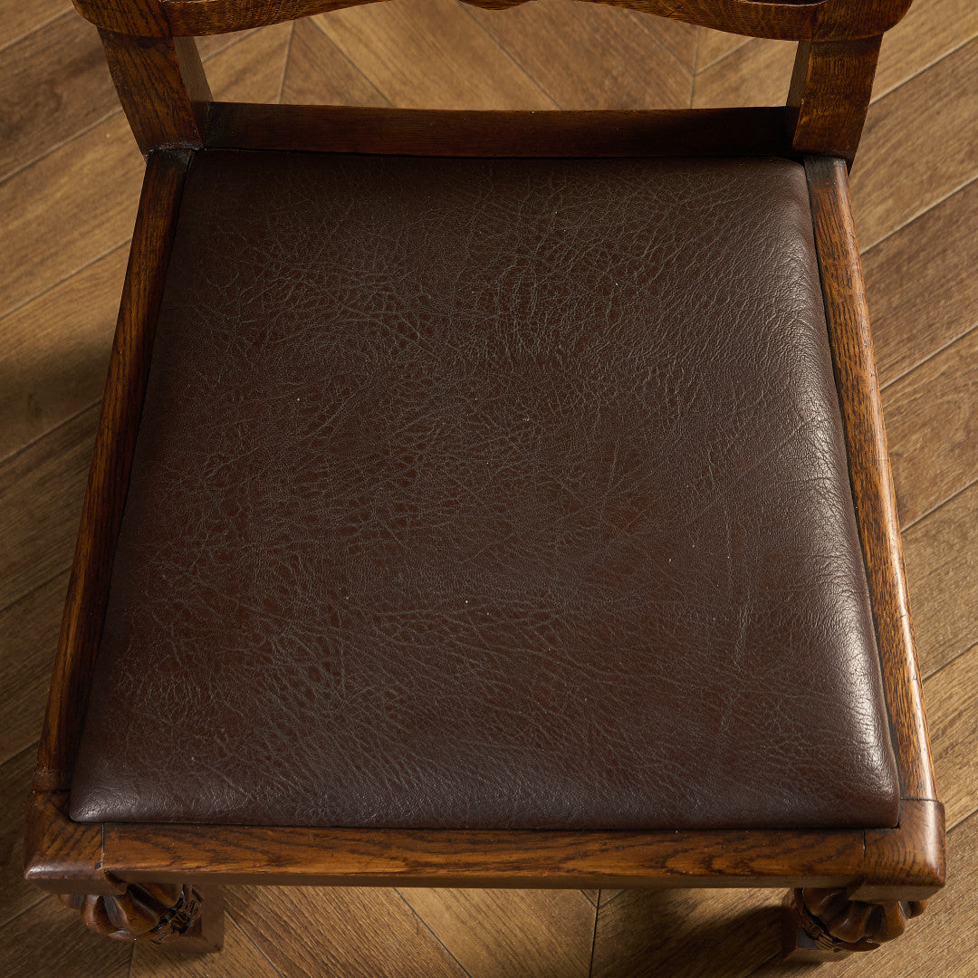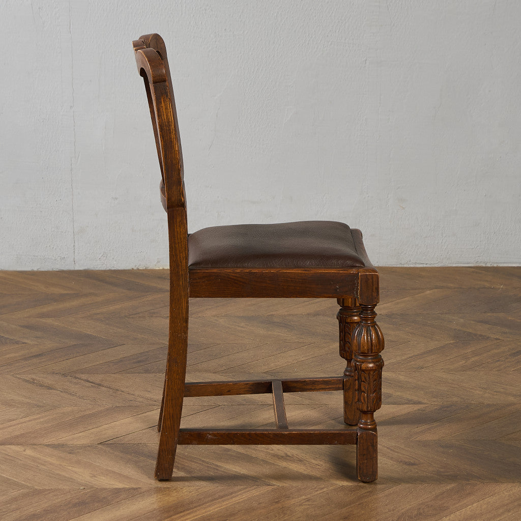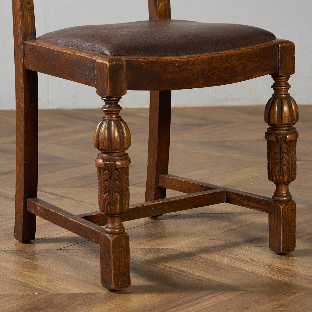 背もたれの木彫刻や脚部に施されたバルバスレッグが美しい上品なダイニングチェア。古き良き西欧の伝統を感じさせるクラシカルなデザインで、使い込まれて程よく古びた風合いが素朴で優しい雰囲気を演出します。