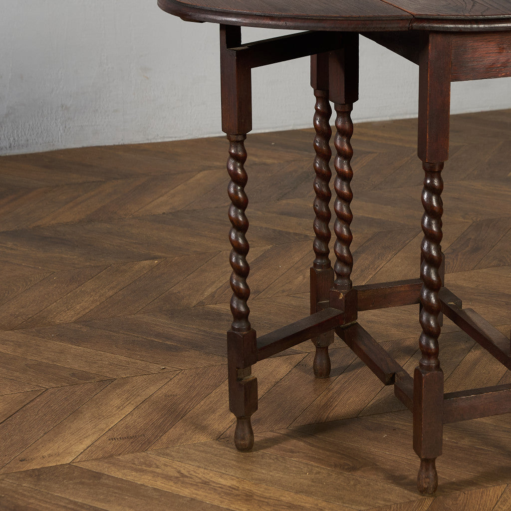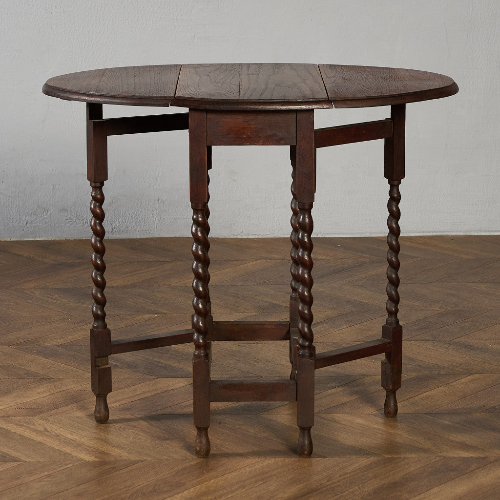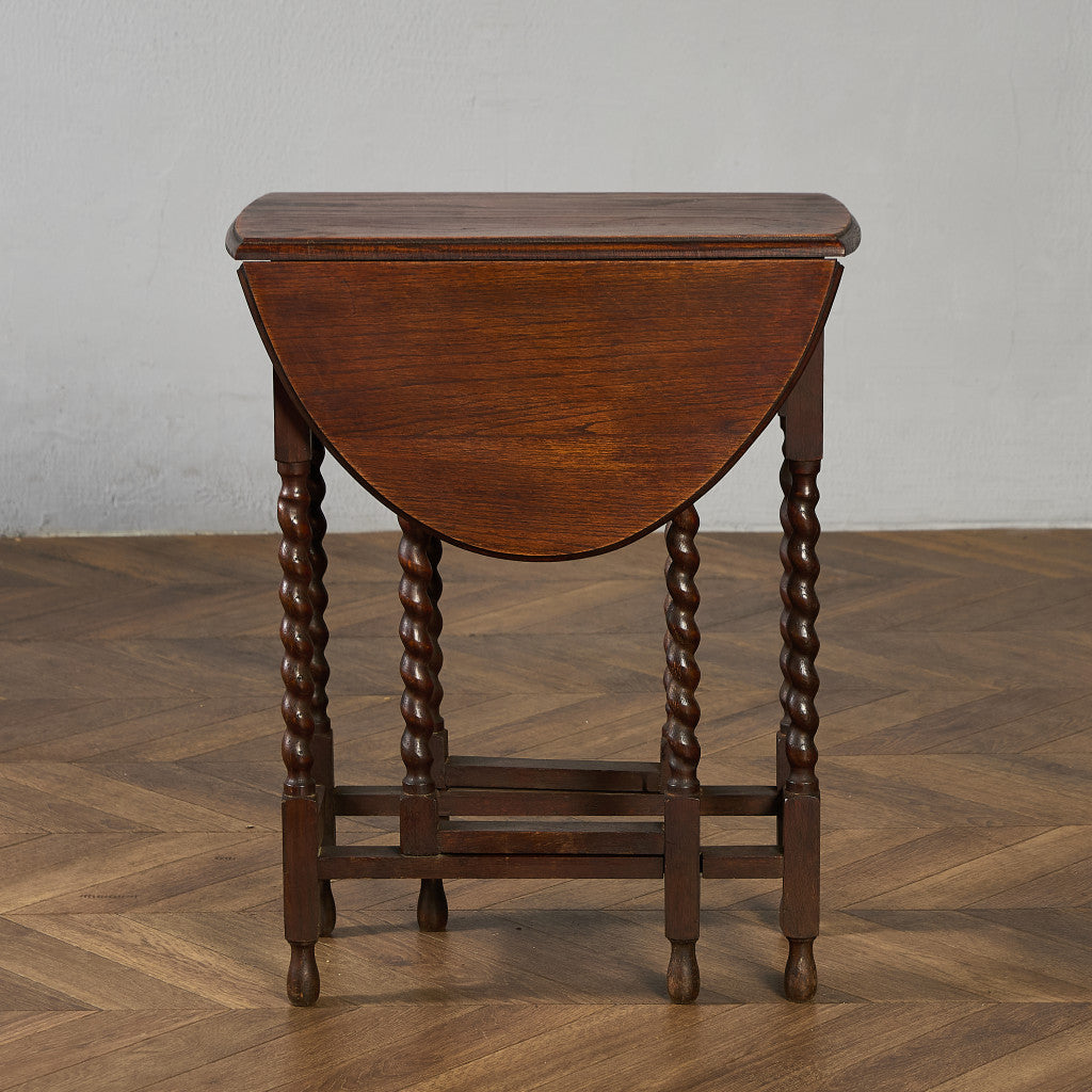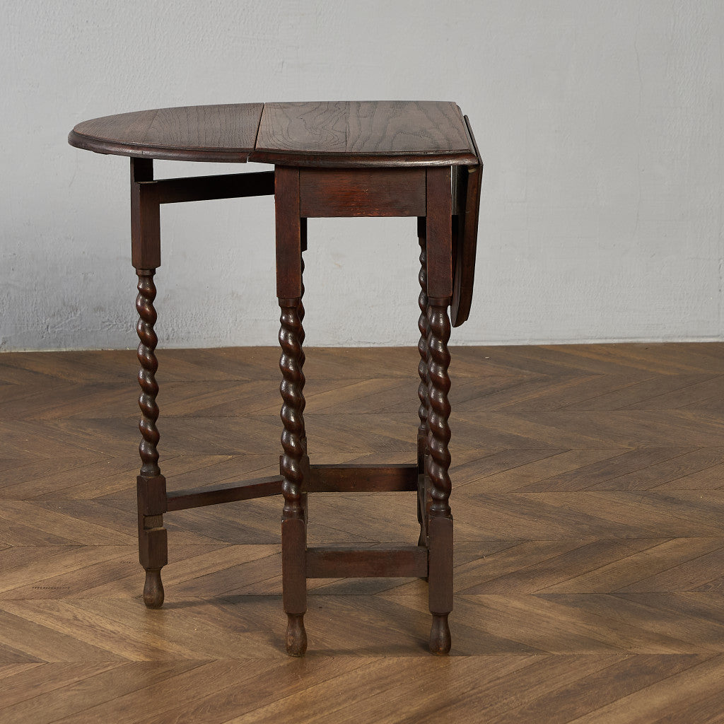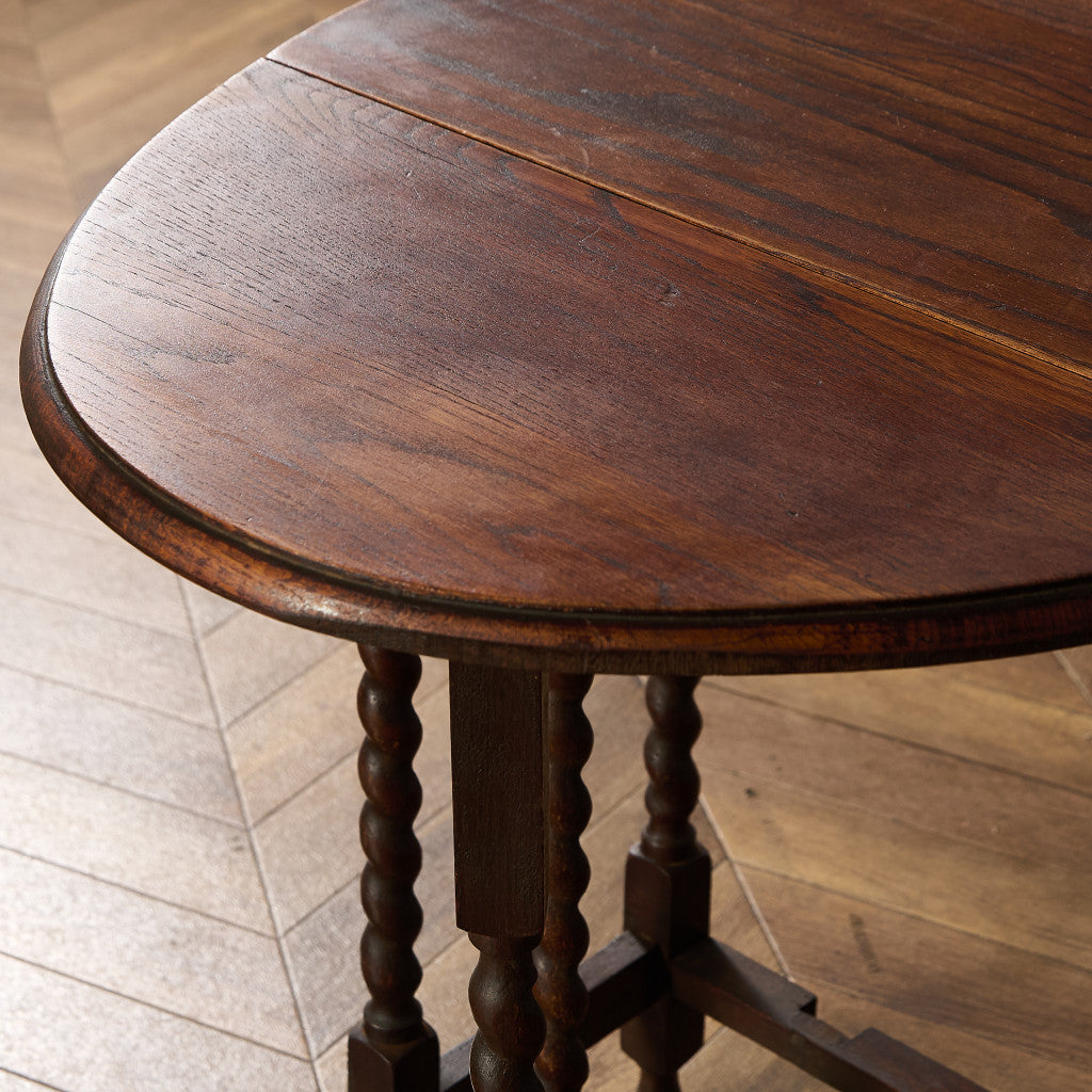 螺旋状のツイストレッグやなめらかに仕上げられた天板のエッジラインなど、随所に美しいディテールを備えたゲートレッグテーブル。シーンに合わせて天板を折りたたむことができ、両天板を閉じると幅が340mmとコンパクトに収まります。古き良き西欧の伝統を感じさせるクラシカルなデザイン、程よく古びた風合いが素朴で優しい雰囲気を演出します。