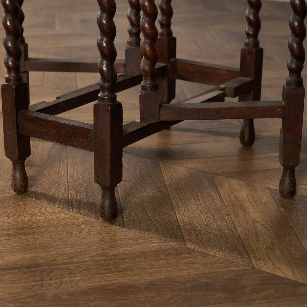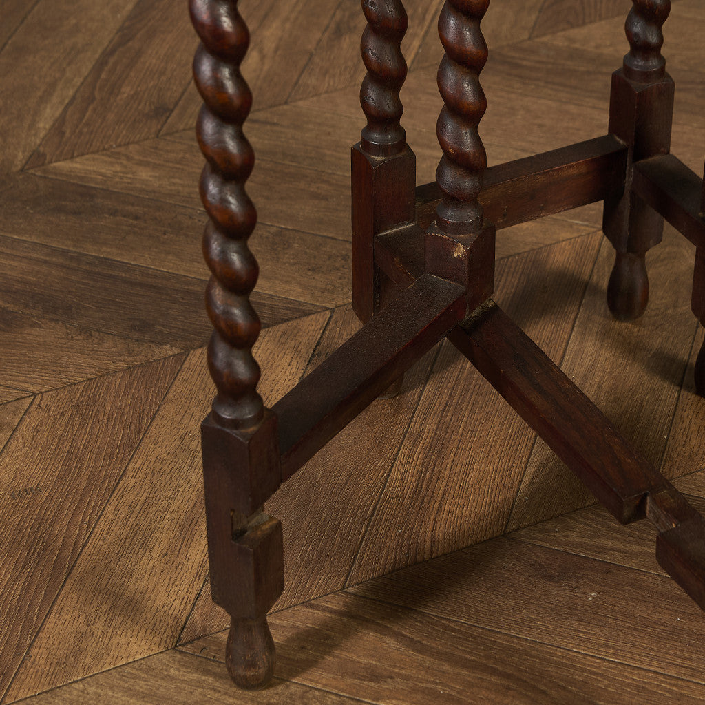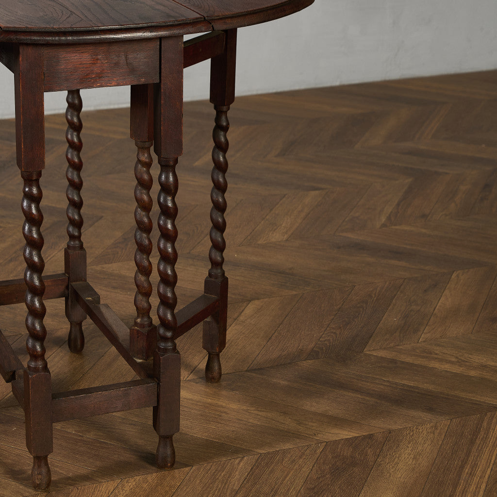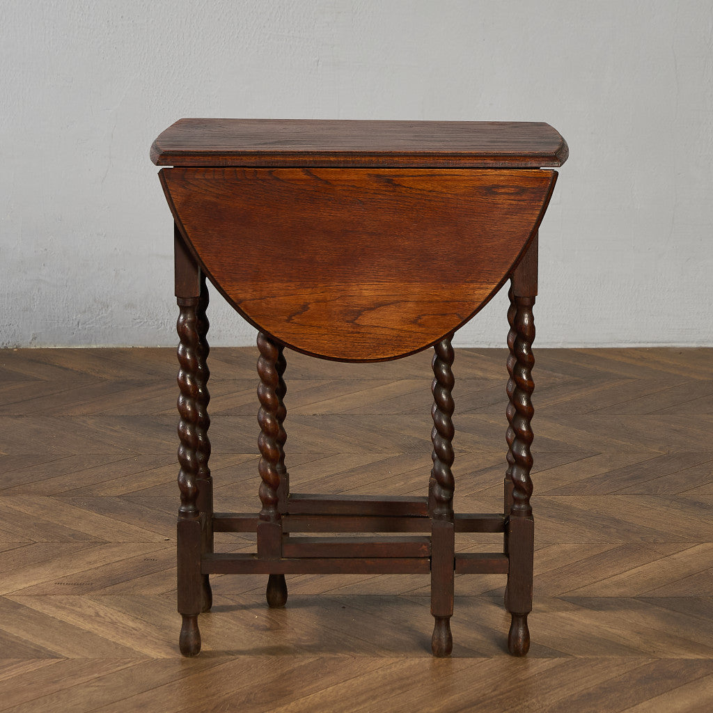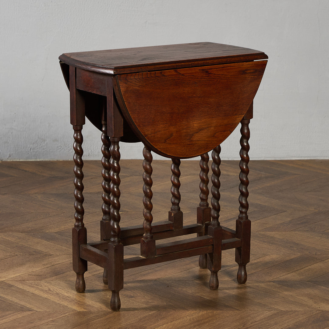 螺旋状のツイストレッグやなめらかに仕上げられた天板のエッジラインなど、随所に美しいディテールを備えたゲートレッグテーブル。シーンに合わせて天板を折りたたむことができ、両天板を閉じると幅が340mmとコンパクトに収まります。古き良き西欧の伝統を感じさせるクラシカルなデザイン、程よく古びた風合いが素朴で優しい雰囲気を演出します。