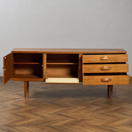 1952年、イギリスの老舗家具メーカーE.Gomme社が戦後の住宅事情に合わせて立ち上げたG-PLANは、「計画的に買い足せる家具」という革新的なコンセプトで英国モダン家具の象徴となりました。従来のセット販売から脱却し、予算に応じて単品購入できるシステムを確立し、数年後に買い足してもシリーズ内で統一感が保たれる設計が特徴です。1960年代にはデンマーク人デザイナーのイブ・コフォード・ラーセンを起用し、北欧デザインの洗練さと英国の堅牢性を融合。チーク材の深い色味を活かした「Fresco」シリーズや、彫刻的な脚部が印象的な「Brasilia」シリーズなど、機能美を追求した名作を生み出しました。初期の金色のEG刻印から中期の赤い円形ロゴシールまで、時代ごとの証が刻まれた家具たちは、1950〜70年代の英国ミッドセンチュリーを代表する存在として、今なお世界中のコレクターを魅了しています。